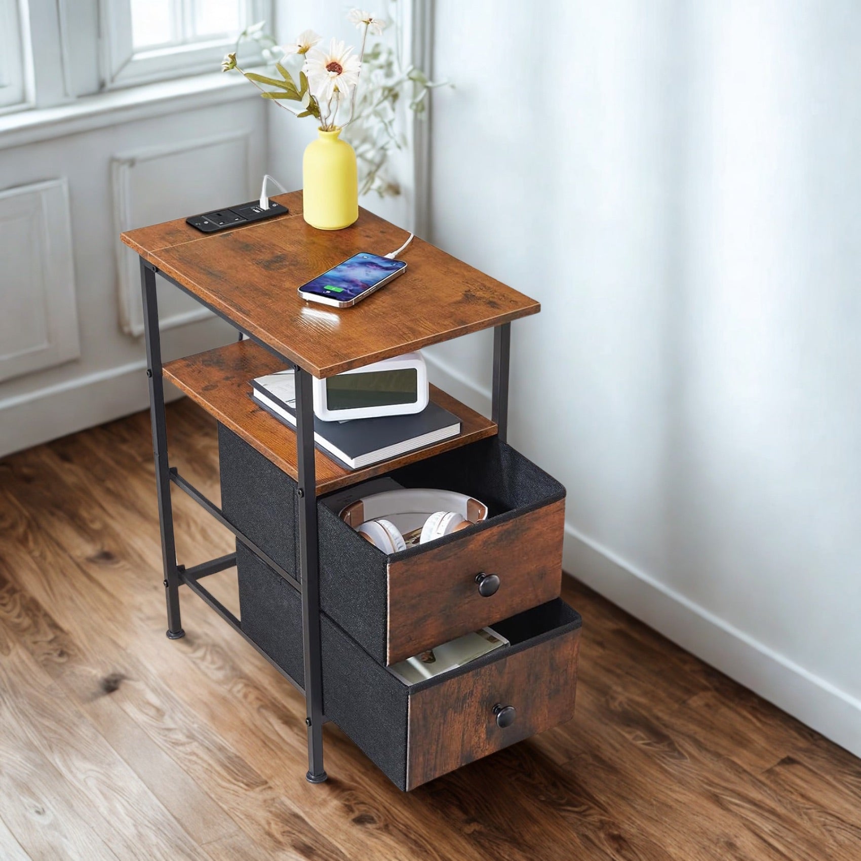 Industrial Nightstand Side End Table With Charging Station and Drawers